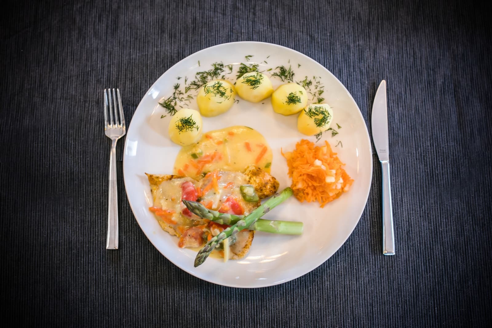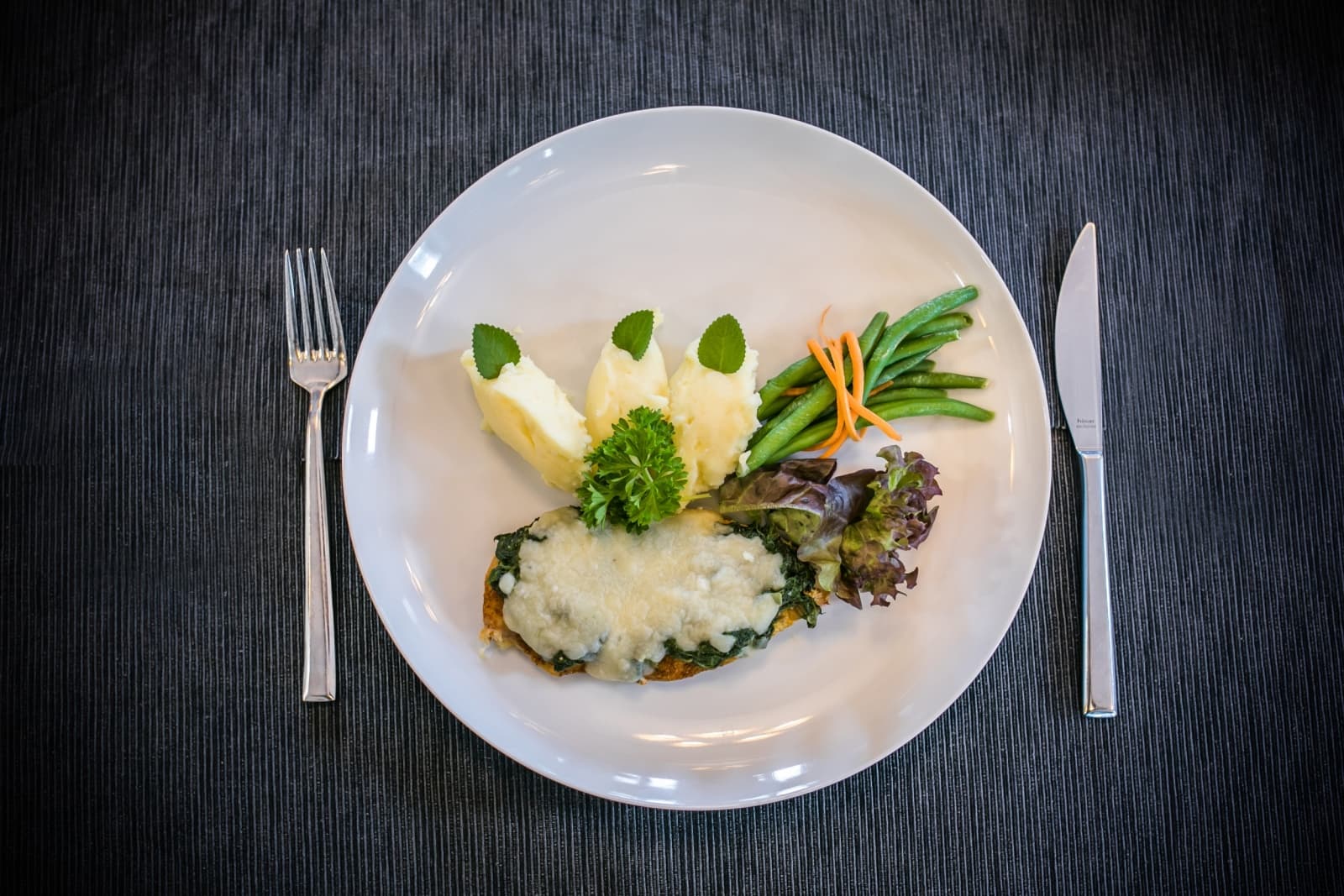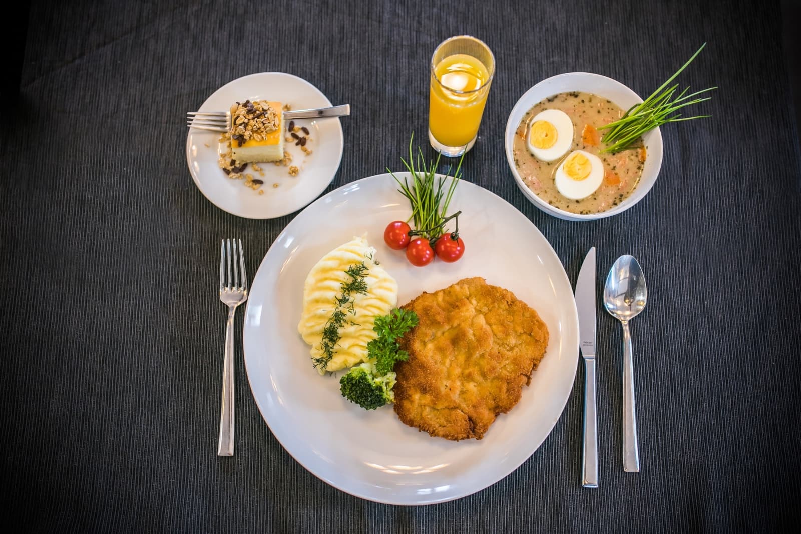 - Filet drobiowy z pieczarkami i serem mozarella, ziemniaki, surówka z marchwi