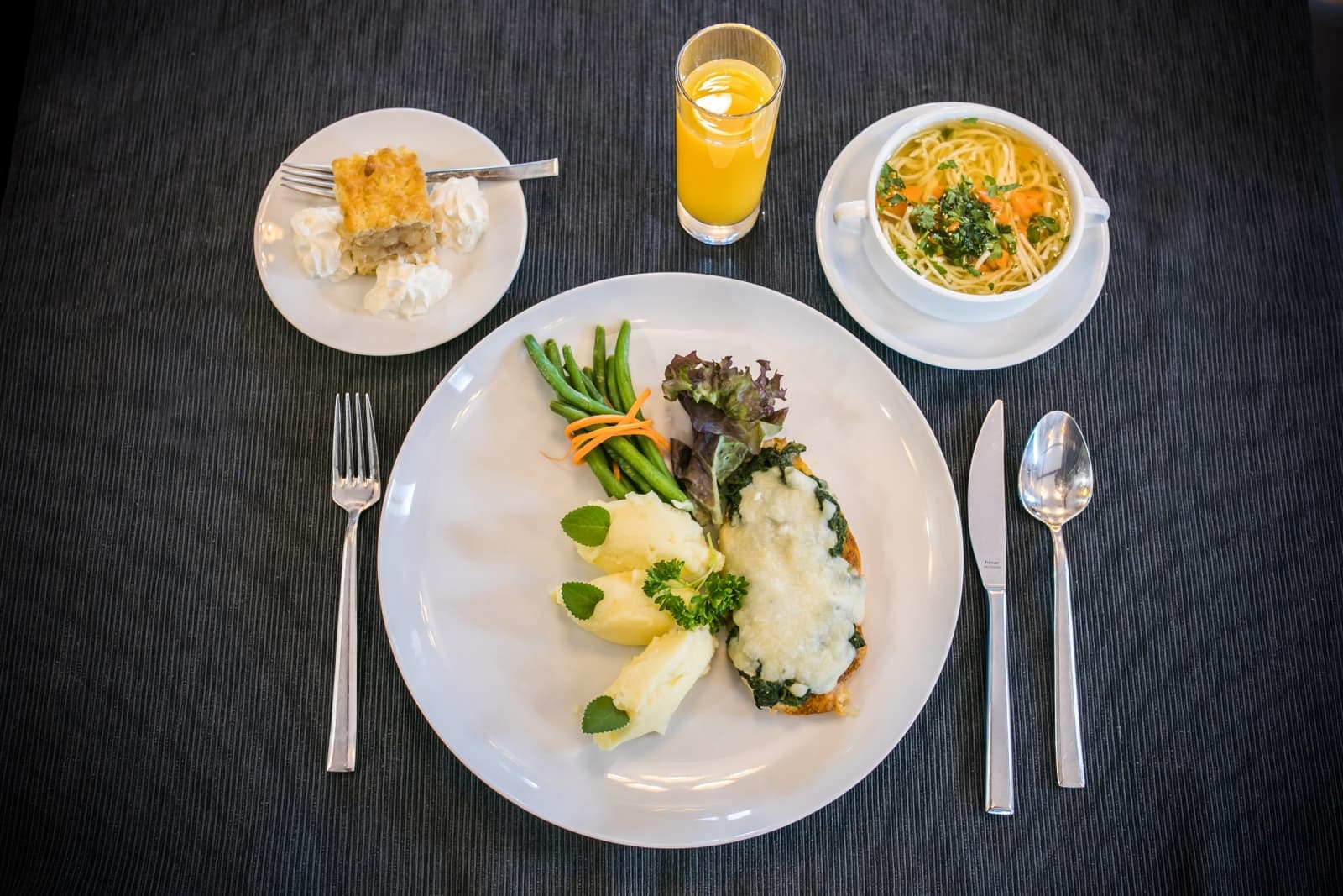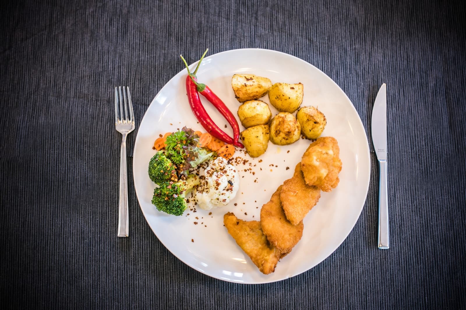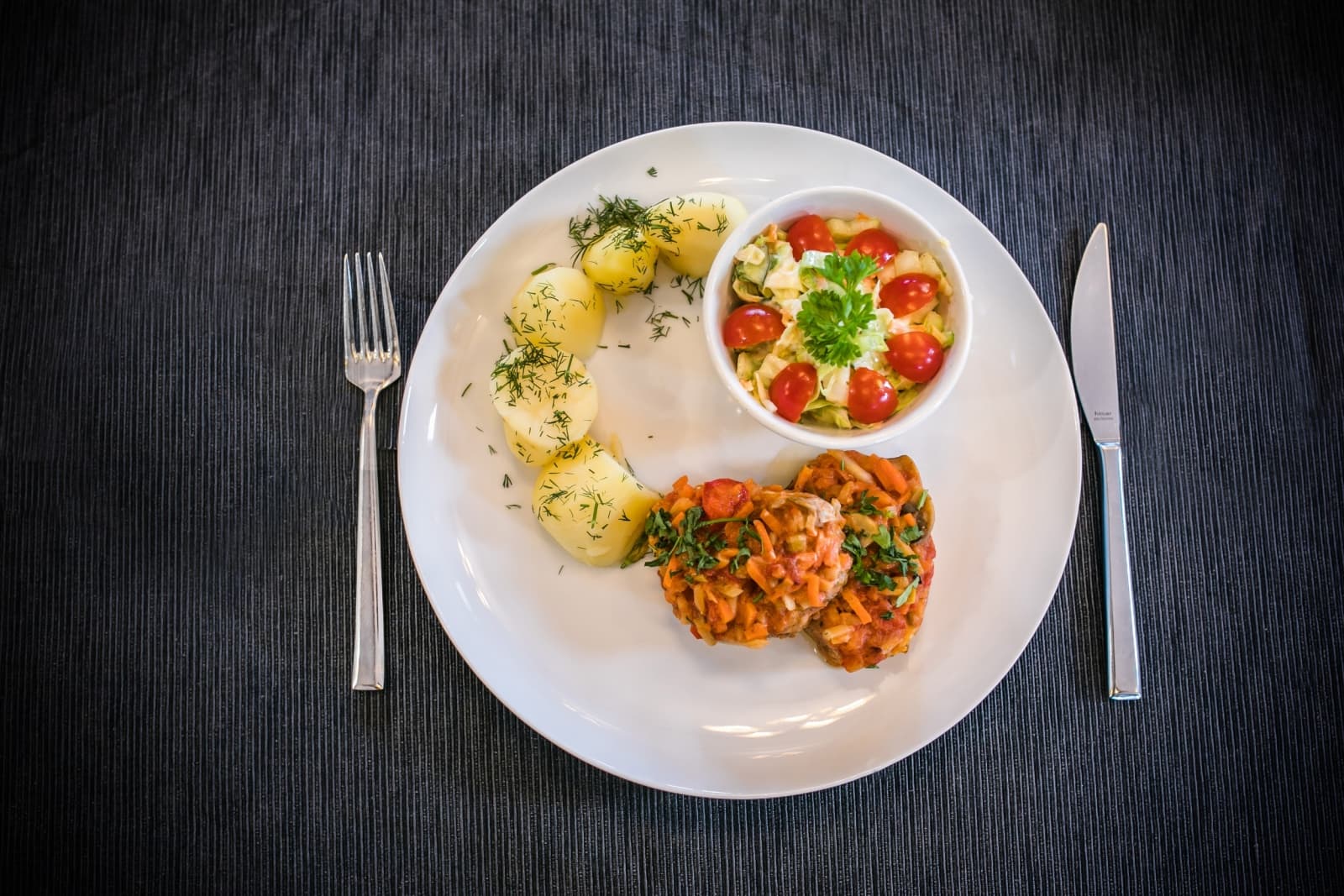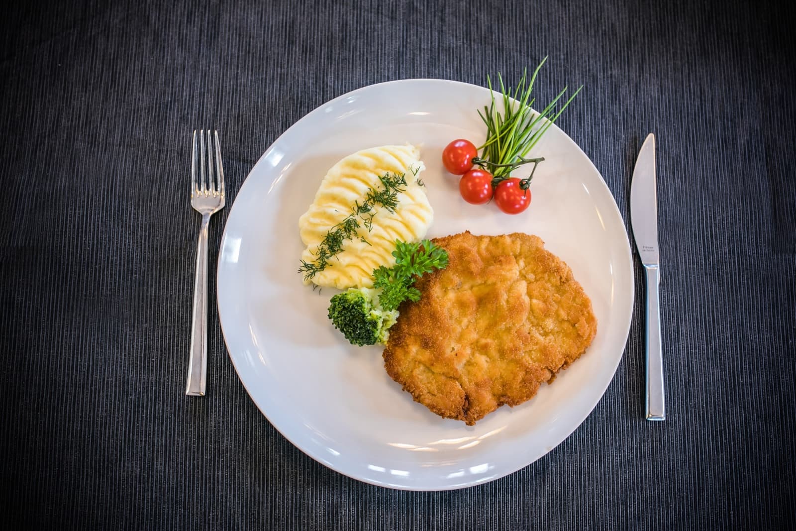 - Filet drobiowy z pieczarkami i serem mozarella, ziemniaki, surówka z marchwi