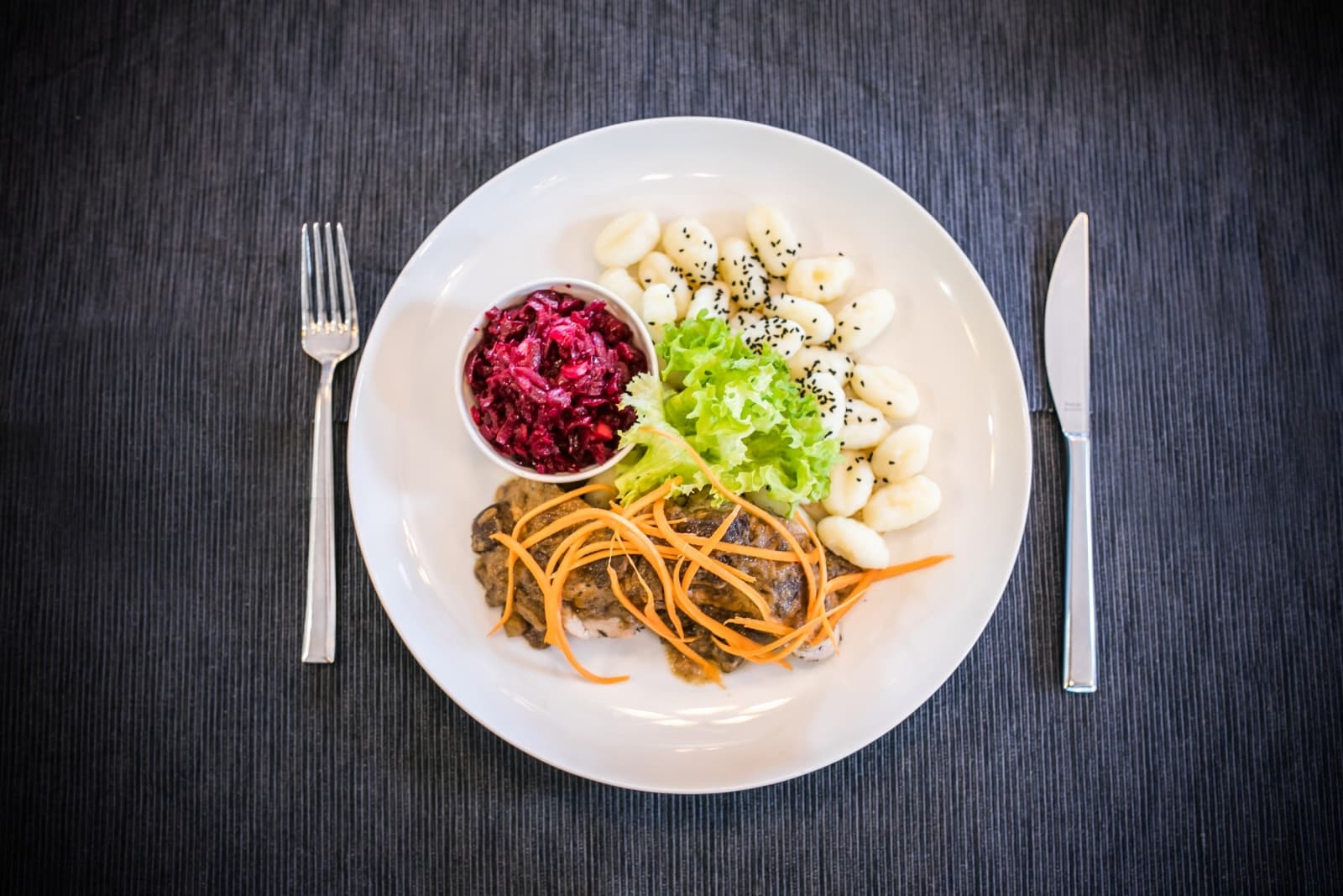 - Zraz wieprzowy w sosie grzybowym, kasza bulgur, buraczki na gorąco